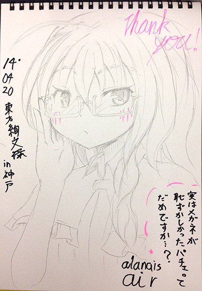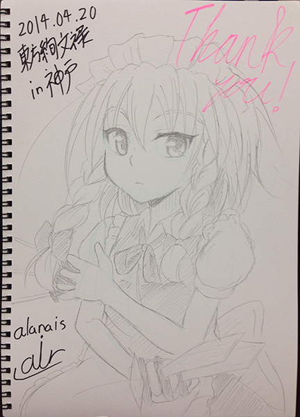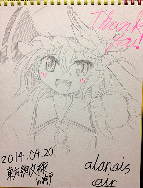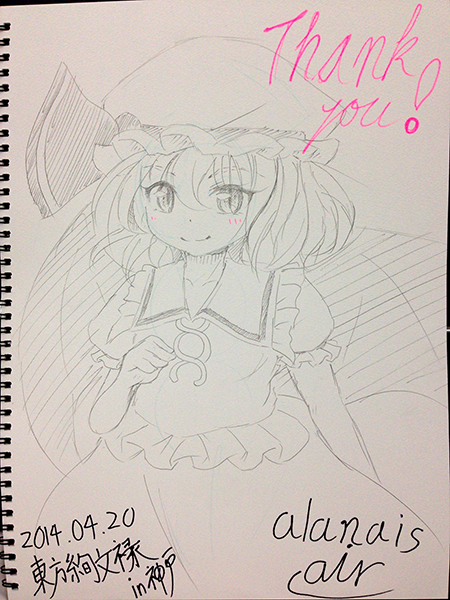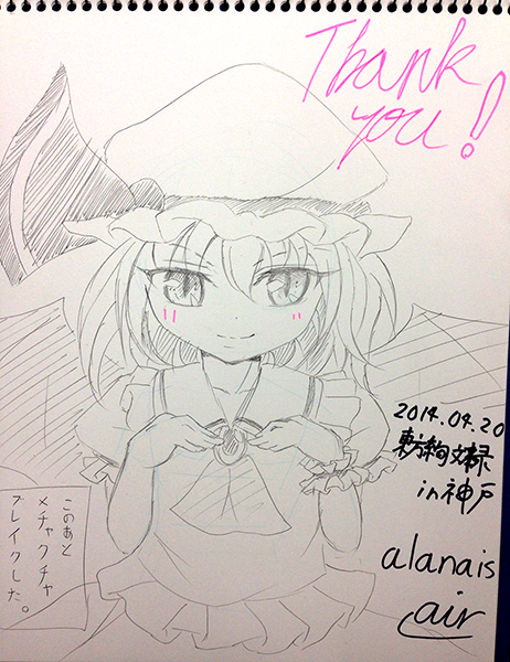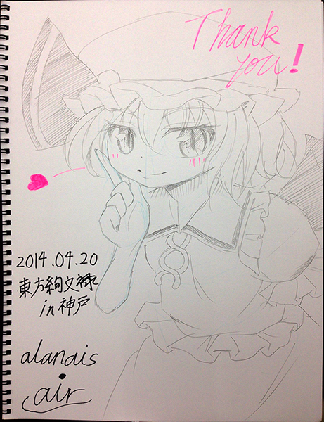 お久しぶりです。airです。 あらためまして ComicTreasure24お疲れ様でした!!! 今回は島中でしたので以前よりは気楽に過ごしてました。 (こらそこ、人が来なかったとか言わないの! 事実であったとしても言わないの!! しーっ!) それからスペースに来て下さった友人の方々、 差し入れもありがとうございました。 (家に帰る前にほぼ胃袋に入っちゃいましたが) やっぱ人と会話するっていうのは良いですね…。 私、コミュ症ですけどね!!! さて、今回の戦利品(&差し入れとか)はこんな感じになりました。 買い物に行ったのが1時半くらいからなので、もう帰ってしまって買えなかったり しましたが、満足です。 でもまだ紅楼夢に参加してる方もいらっしゃったのでそちらで今回買えなかった方の 本を買いに行くとしましょう。 俺たちの満足はこれからだ!!! さて、今回はちょっとえっちぃ絵を描いてみました。 なんか、コミトレ後にふと描きたくなったのですが、いままで描けずにいました。 そうです。絵をサボっていました。(おい) ということで、えっちぃ絵です。 絆創膏こそ正義! さて、みなさんが賢者モードになった所でお知らせです。 来月の10月12日(日)にインテックス大阪で開かれる 東方紅楼夢 にサークル参加いたします! 新刊はもし出来たらコピ本かな。 alanaisのサークルスペースナンバーは 6号館B棟J-5b です! 色紙も何枚か描いていきますので。(早い者勝ちです) よろしくお願いします!! PR |