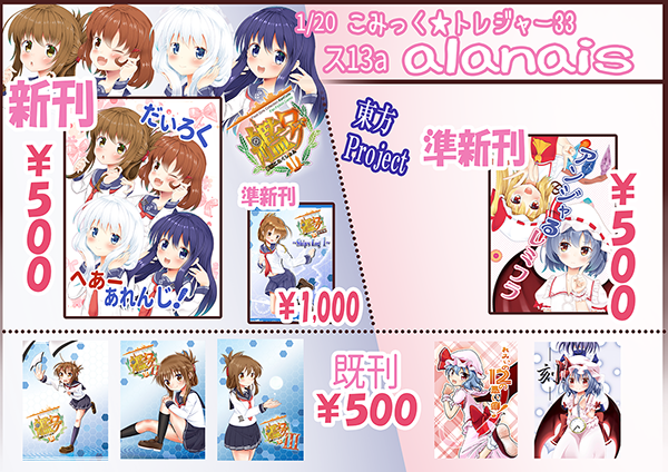 最近はイベント情報しか上がらないこのブログ 普段はTwitterの方が確実ですのでそちらをフォローしていただいた方が良いかと ってことになるとなぜブログやってるの?って思うairです。 さて、1月20日にインテックス大阪で開かれる こみっくトレジャー33 に参加いたします! スペースは 4号館ス-13a alanais にてお待ちしております! 当日の新刊は第六駆逐隊の短編ものです。 第六駆逐隊のみんなが朝のしたくで 髪の毛をいつもとは違う髪型にアレンジするほのぼの話です。 画像クリックでpixivの新刊サンプルへと跳びます。 今まで私の描く艦これ漫画は 電ちゃんの初期艦として着任したマンガ 「艦ログ」 上記の文字クリックでニコニコ静画マンガへと跳びます。 の書籍版でしたが 今回はそちらはひとまず筆を置きまして 短編もので描いてみました。 艦ログはもう終わりなの?と思って下さってるかた 安心して下さい、描いてますよ! (股間を指差しながら) いろいろあってまだ投稿してないだけですので ご安心ください。 そしてコミックマーケット94で出した 艦ログの総集編1 も、こんかいのこみっくトレジャー33に持っていきます!! 更にその後の東方紅楼夢新刊も今回お持ちしますので また手に取っていない方はこの機会に是非! |