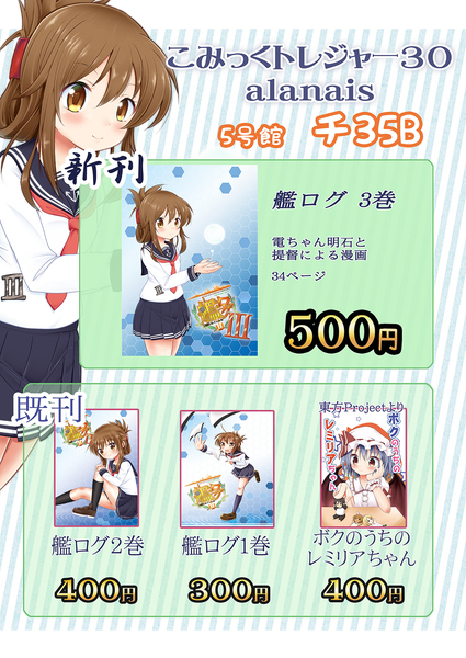 放置放置放置となんどもなんども申し訳ございません。 お久しぶりです。airです。 液晶タブレット机の記事から半年、 マンガのアシスタントなどをしたりpawooでのんびりしたりと 過ごしておりました。 さて、今回は9月3日(日)(←今日)にインテックス大阪で行われる こみっくトレジャー30 のお品書きになります。 五号館のチ35Bになっております! 当日では ピクシブ : https://www.pixiv.net/member_illust.php?mode=medium&illust_id=51737294 ニコニコ静画 : http://seiga.nicovideo.jp/seiga/im5085603 ニコニコ静画マンガ :http://seiga.nicovideo.jp/comic/22208 で不定期で更新している各話に加筆修正、 さらに同人誌書き下ろしマンガをくわえた 艦ログ3巻 を頒布致します。 そしてまさかの34Pもの収録になっております! (初めての30P越え……) また、とらのあな様とメロンブックス様、DLsite様とDMM様で委託予定ですので、 当日会場に来られない方も、ぜひお手にとって頂ければ幸いです。 メロンブックス様: https://www.melonbooks.co.jp/detail/detail.php?product_id=283672 とらのあな様: http://www.toranoana.jp/mailorder/article/04/0030/56/97/040030569725.html DLsite様(電子書籍): http://www.dlsite.com/home/work/=/product_id/RJ207773.html DMM様(電子書籍): http://www.dmm.co.jp/dc/doujin/-/detail/=/cid=d_116698/ それでは、当日(ていうか今日)はよろしくお願いいたします! PR |